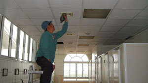 金屬制品天花清潔工具設備準備:鋁梯、毛巾、雞毛撣、被單布、吸塵機、警示牌、安全帶。