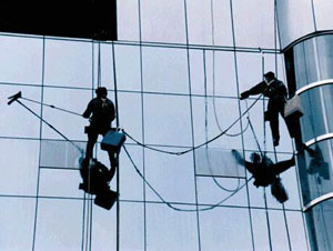 一.擦拭玻璃方法:檢查玻璃上有無粘著物等污跡,如有,先用刮刀等相應輔助工具和溶劑除去.將毛滾浸入桶中,待清潔劑充分吸入后,用手輕輕捋一下(以不入下滴水為宜),均勻涂抹在玻璃上.涂抹時,一般為由上往下滾,橫向移動,每趟滾跡要交叉相壓,以防漏涂.用膠刮將涂抹在玻璃上的清潔劑刮凈,操作時應稍用力,將膠刮均勻按壓在玻璃上,由上至下慢慢刮動,一次刮凈一溜,用濕毛巾擦凈膠刮后,再橫向移動刮另一溜.玻璃刮凈后,用毛巾將窗擦凈.確認一次應作業范圍的玻璃已擦拭完畢,滑動吊籃或吊板,繼續往下作業.