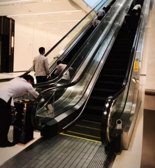 首先選擇晚間沒有人上下電梯的時候,讓電梯工關閉電源,在工作區域位置范圍放置“正在清潔的標志牌,然后用掃把清掃大垃圾然后用吸塵器吸除小垃圾。再用抹布抹干凈扶手帶及兩側護板,用玻璃刮對玻璃、不銹鋼處刮理干凈,最好將拖把浸入已配制好清潔劑的水桶中,拿起后擰干,用力拖抹著陸區、步梯,再將拖把浸入另一桶清水中,拿起后用力擰干,重復拖抹著陸區、步梯。注意一定要將拖把的水擰至不滴水為宜,以防止水滲入到機廂內,造成電動機受潮和機件損壞。然后就是巡回保潔,用干毛巾除塵就可以了。